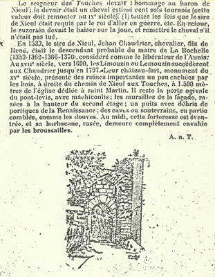 Au mariage de sa fille Marie-Henriette avec Pierre Boscal Réal de Mornac, Gabriel Isaïe Lemousin laisse en dot à sa fille la nue-propriété du fief de Nieul et en garde l'usufruit. Marie-Henriette décède quelques années plus tard laissant deux enfants dont François-César. A la révolution son père émigrera à Hambourg emmenant François-César, héritier de la nue-propriété de la terre de Nieul. Le comité de salut public, arguant de l'émigration de l'héritier, prétend vendre la terre de Nieul en tant que Bien National. C'est sans compter sur l'obstination et le courage de Gabriel Isaïe Lemousin, vieillard de 83 ans, qui revendiquera son droit d'usufruit dans la lettre ci-dessous, conservée aux archives de la Rochelle. On lui donnera raison ; il mourra de sa belle mort en 1797, à l'age de 87 ans ; la même année son petit-fils, François-César, tout jeune homme encore, décèdera à Hambourg dans des circonstances inconnues. Le Château en déshérence sera vendu en tant que Bien National que se partageront trois familles d'agriculteurs. Dès 1836 il est décrit comme en ruines (voir document joint). Sa renaissance débutera en 1972.